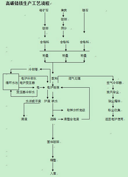 高碳鉻鐵主要用于不銹鋼生產,其中200系不銹鋼含鉻量約在16%,300系不銹鋼含鉻量約在25%,400系不銹鋼含鉻量約在14%。鉻鐵需求量大的300系不銹鋼也是不銹鋼生產中大比例的產品。 用作含碳較高的滾珠鋼、工具鋼和高速鋼的合金劑,提高鋼的淬透性,增加鋼的耐磨性和硬度;用作鑄鐵的添加劑,改善鑄鐵的耐磨性和提高硬度,同時使鑄鐵具有良好的耐熱性;用作無渣法生產硅鉻合金和中、低、微碳鉻鐵的含鉻原料;用作電解法生產金屬鉻的含鉻原料;用作吹氧法冶煉不銹鋼的原料。 高碳鉻鐵的冶煉方法有高爐法、電爐法、等離子爐法等。使用高爐只能制得含鉻在30%左右得特種生鐵。截至2012年,含鉻高的高碳鉻鐵大都采用熔劑法在礦熱爐內冶煉。 電爐法冶煉高碳鉻鐵的基本原理是用碳還原鉻礦中鉻和鐵的氧化物。碳還原氧化鉻生成Cr2C2的開始溫度為1373K,生成Cr7C3的反應開始溫度1403K,而還原生成鉻的反應開始溫度為1523K,因而在碳還原鉻礦時得到的是鉻的碳化物,而不是金屬鉻。鉻鐵中含碳量的高低取決于反應溫度。生成含碳量高的碳化物比生成含碳量低的碳化物更容易。